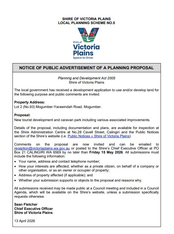 The Shire of Victoria Plains has received a development application to use and/or develop land for a New Tourist Development & Caravan Park and public comments are invited.